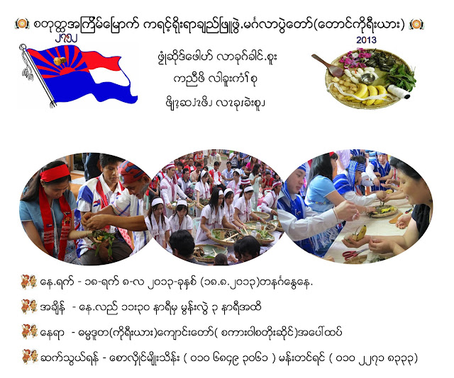 က်ေတာ္မ်ားေတာင္ကိုရီးယားႏိုင္ငံေရာက္ ကရင္အမ်ိဳးသားမ်ားမွ စတုတၳအၾကိမ္ေၿမာက္ ကရင့္ရိုးရာခ်ည္ၿဖဴဖြဲ.မဂၤလာပြဲေတာ္ၾကီးအား (၁၈.၈.၂၀၁၃)တနဂၤေႏြေန.တြင္ ဓမၼဒူတ(ကိုရီးယား)ေက်ာင္းေတာ္ (စကား၀ါစတိုးဆိုင္)အေပၚထက္တြင္ကရင္လူမ်ိဳးတို.၏ ကရင့္ရိုးရာခ်ည္ၿဖဴဖြဲ.မဂၤလာပြဲေတာ္ကိုစည္းကားသိုက္ၿမိဳက္စြာက်င္းပမည္ၿဖစ္ပါေသာေၾကာင့္
